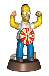 Homer Simpson animated alarm clock features - Demo button 0 - 9 Minute snooze button - Homer's belly is an analog clock with hour, minute, and second hands - Homer moves, sings, and talks with the alarm or demo button - Alarm on/off switch - Analog clock has utensil shaped minute and hour hands; the clock face is pink and alternates between numbers and pictures of Homer's favorite foods for hour markers - Homer stands on a black base next to a donut box, and he holds a donut in one hand and a hamburger in the other - Homer is shown in his traditional colors - Requires 4 C batteries, not included - 90 Day limited manufacturer's warranty