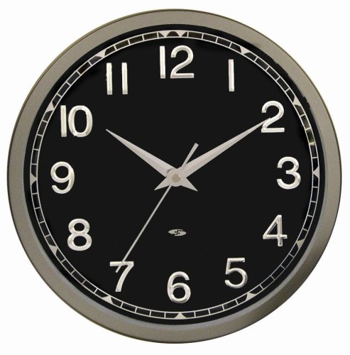 10" Metal Wall Clock with Set & Forget® Technology. Plastic lens with a metal case. Dramatic black face. Uses 1 AA battery. (not included)